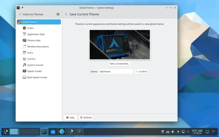 In the Colors & Themes settings page, you’ll see a new “Save Current Theme” button, allowing to save current settings (e.g., colors, window decoration, icons, cursors, desktop and window layout) as a custom global theme with custom name and thumbnail image.