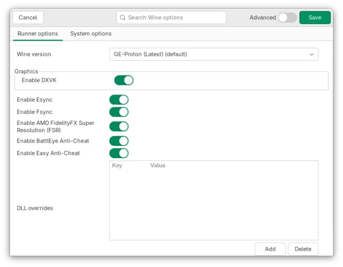 Proton-GE, the umu version of Valve’s Proton, is now the default for the Wine runner. And, it comes with Esync, Fsync, DXVK setting options, as well as DXVK’s integrated D8VK enabled.