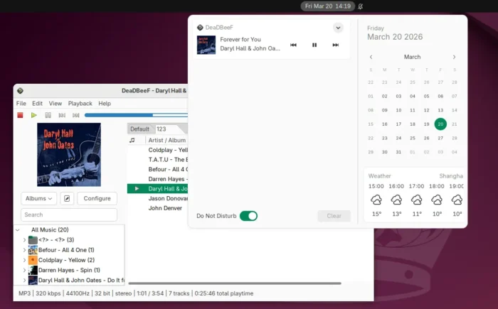 Meaning you can now control music playback either by using keyboard media keys (previously implemented via global shortcuts), panel widget (e.g., GNOME data & time menu), or even from Gnome 49+ lock screen. Or, query and control player from command line, scripts, or remotely through a mobile device.