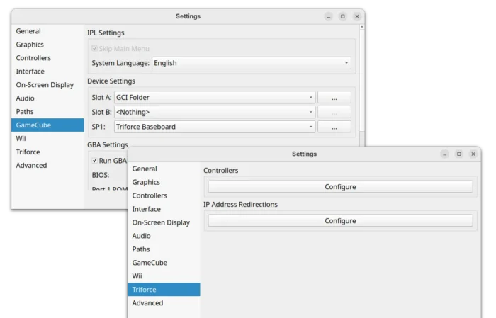 All the Triforce games are now playable. User can setup Dolphin for Triforce emulation by going to Options -> Configuration -> GameCube -> SP1 device settings for triforce baseboard, and go to the new Triforce setting page to configure the controllers and IP address redirections