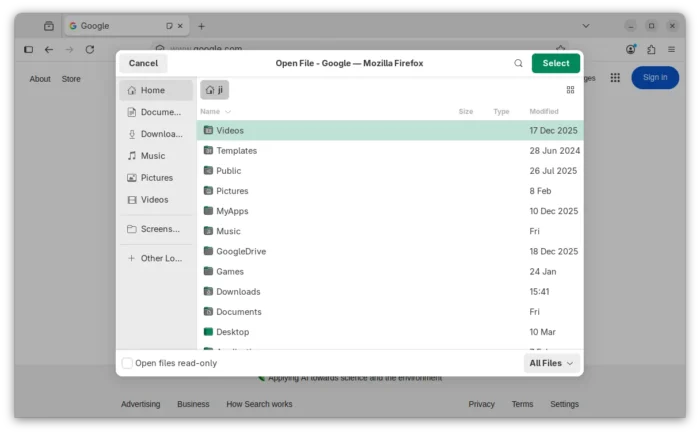 For Linux user, the new 149.0 version finally default to the XDG portal file picker if available, instead of using the GTK3 one. So that, it will be well integrated by trying to use your desktop native file chooser dialog.
