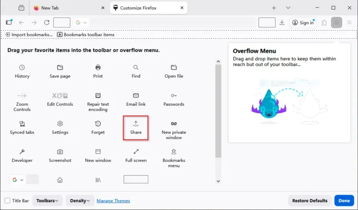 For Windows and macOS, user can now add a share button to the toolbar via “Customize toolbar” page, making easy to share a page using system sharing options.
