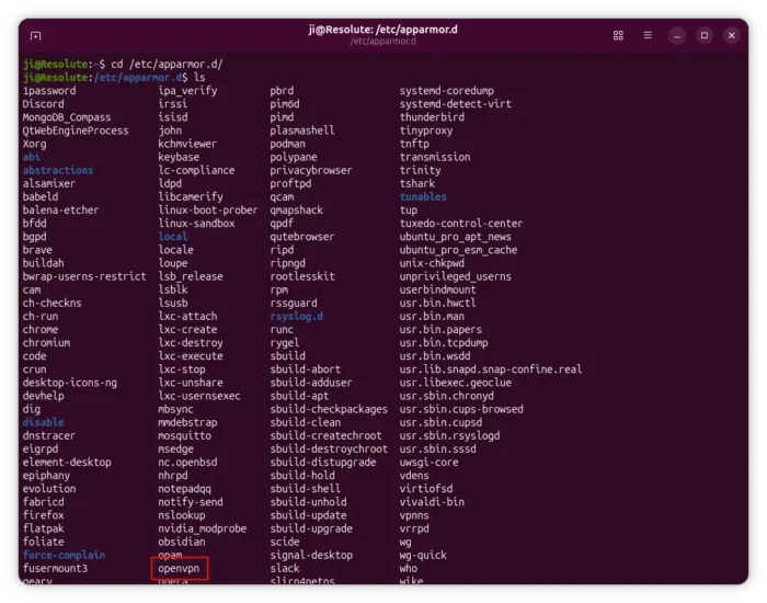 It uses a list of profiles under /etc/apparmor.d directory to define and restrict the applications’ capabilities. And, AppArmor in Ubuntu since 25.04 added a profile for openvpn to restrict its capabilities.
