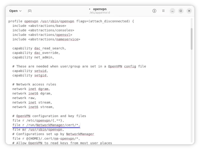 sudo gnome-text-editor /etc/apparmor.d/openvpn