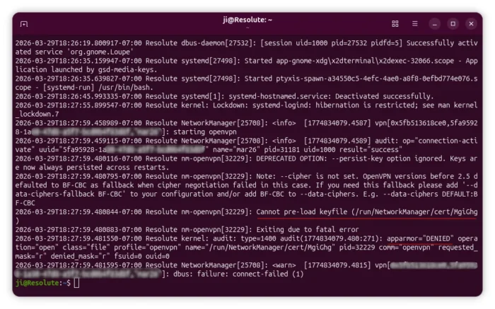 2026-03-30T04:47:32.996275-07:00 Resolute nm-openvpn[70487]: Cannot pre-load keyfile (/run/NetworkManager/cert/NVIziP)