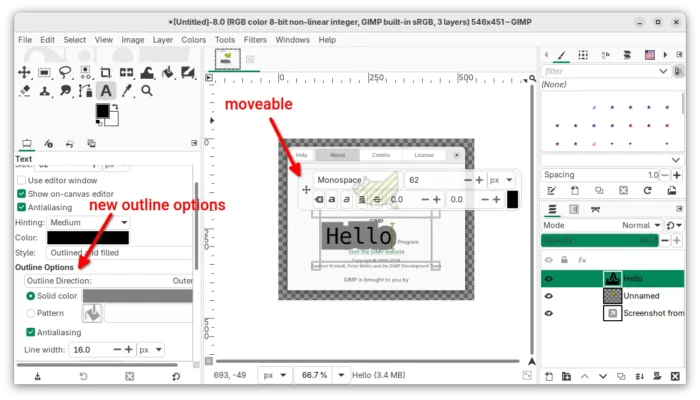 The Text tool has been updated with new Outline Direction option, allowing to grow text outline inward, outward, or in both directions. The on-canvas editor is now movable by dragging on the four-direction arrow icon.