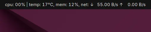Or set cpu: {cpu} | temp: {cputemp}, mem: {mem}, net: {net} to show CPU usage and temperature, memory usage and network upload/download speed, that will look like: