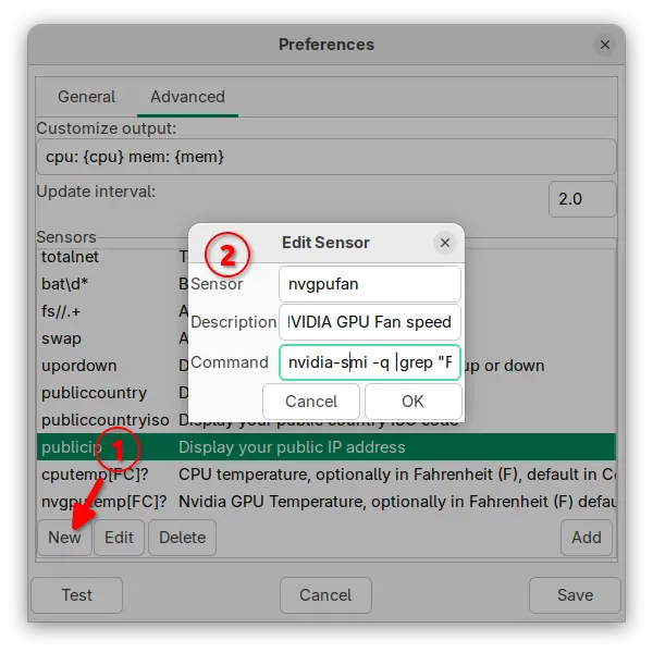 Advanced users can monitor more sensors (such as fan speed, CPU/GPU frequency) that are NOT available in the preferences, by clicking on “New” button and add custom command to report the target sensor data.