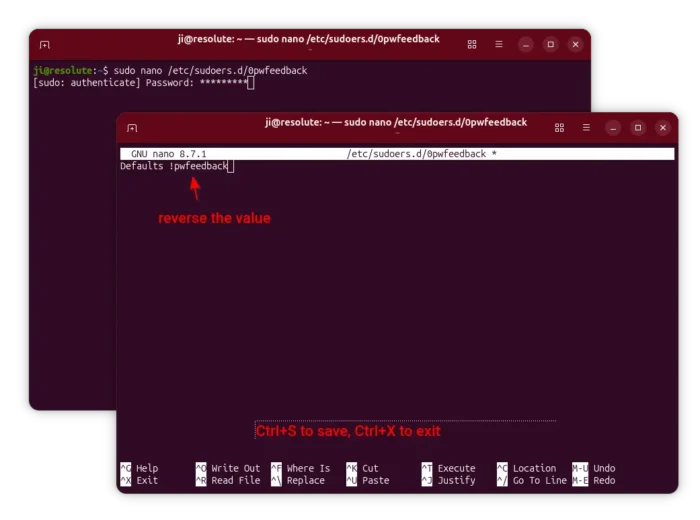 0pwfeedbackfile under/etc/sudoers.ddirectory (just like Linux Mint does) and open it with nano command line text editor. - When file opens, simply insert the line below: