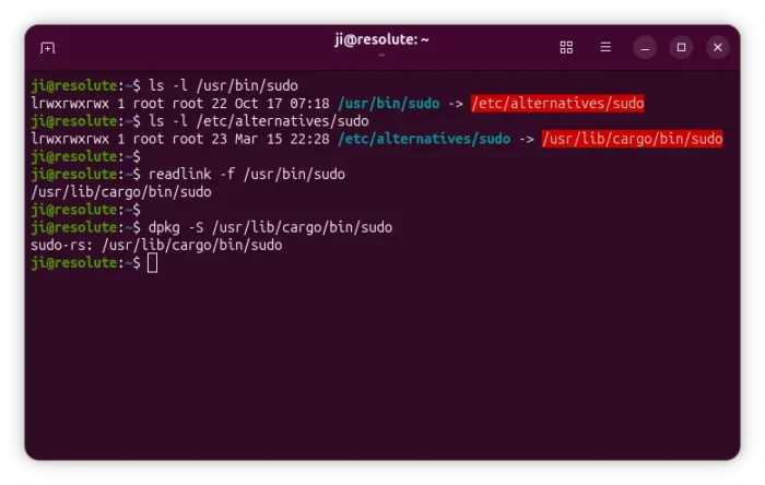 sudo in ubuntu 26.04 is link to rust-based sudo implemention