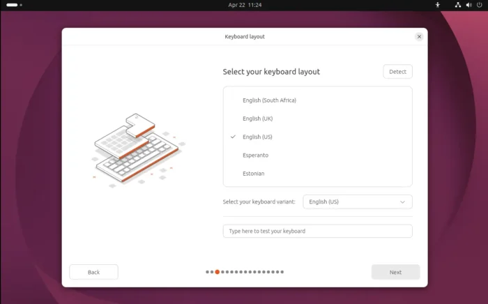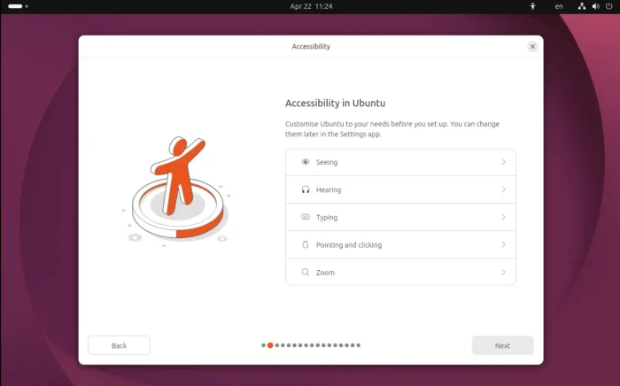 Follow the wizard to select language, configure accessibility settings, keyboard layout.