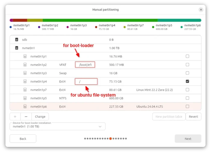 If you previously has an operating system on the disk, then there should already be a VFAT partition for boot-loader. And, in my case it’s automatically marked as /boot/efi after created the “/” file-system partition. If NOT, manually create a 500 MB partition, FAT32 file-system and mounted on /boot/efi.