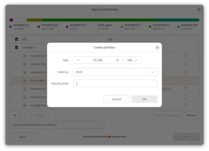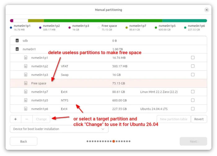 If you selected Manual installation, then it will show you the partition table for your disks. You need to either manually delete useless partitions to make free space, or, select a target partition and click “Change” button to use it for Ubuntu 26.04.