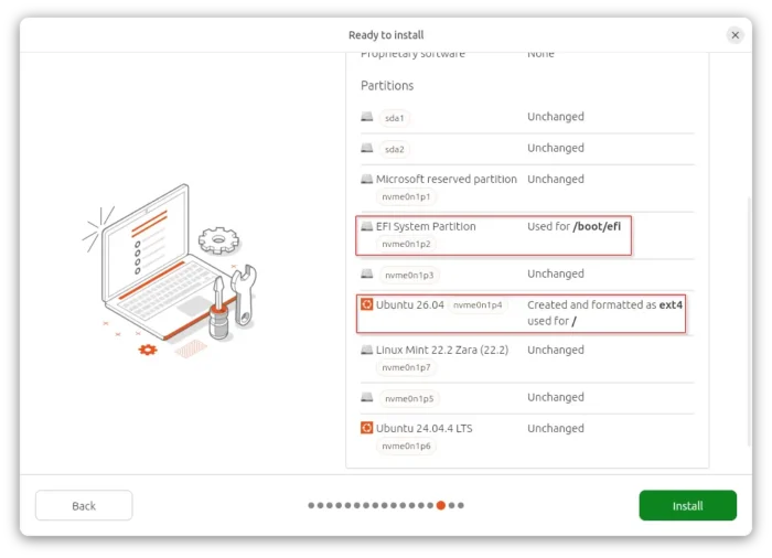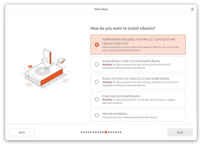 - Install Ubuntu alongside existing systems – shrink a selected disk partition, to make room for Ubuntu 26.04. No data will be lost.