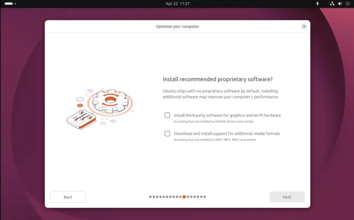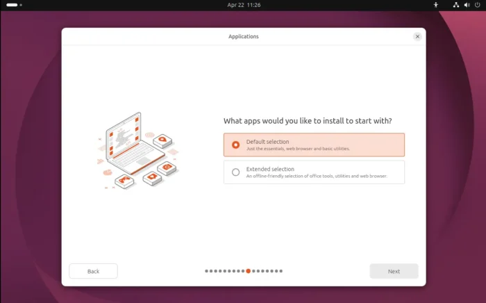 Depends on your need, you may select “Default selection” in next page and install required apps afterwards, or select “Extended selection” mode to have more default apps pre-installed, like Ubuntu 22.04 and earlier do.