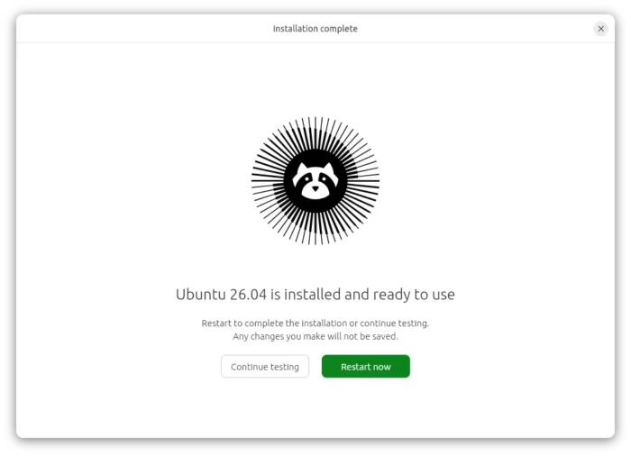 If everything goes well, it will show you installation complete with options to either continue testing the live system or restart computer.