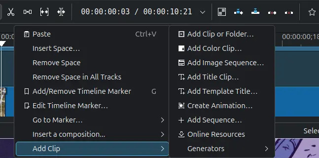 Just right-click in blank area in timeline, and go to “Add Clip” sub-menu. Then, you’ll be able to add a video clip, color clip, image sequence, title clip, online resources, create animation or generate counter, color bars, or white noise at the clicked position.