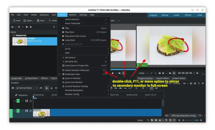 First, for multiple monitor users, the new Kdenlive 26.04 added screen mirroring feature. Instead of detaching, it can now mirror video preview to external monitor in full-screen. So that you can now preview video clips both in usual interface and larger view at the same time.