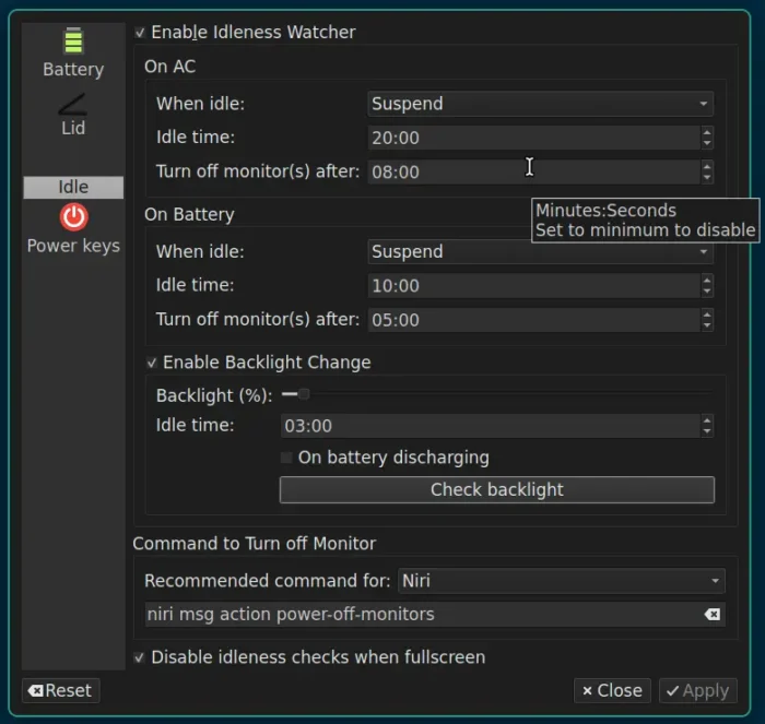 For laptops, the idleness option for turning off monitor(s) now has separate settings for both the cases running on battery and with AC power connected.