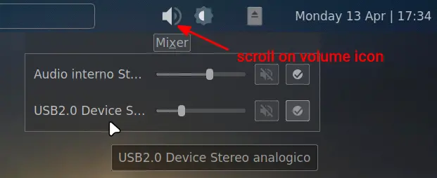 The volume indicator in the system tray area has been updated with a horizontal layout, and ability to display all available sinks. And, user can now move cursor over the indicator icon, and use mouse wheel or touchpad scrolling to change volume.