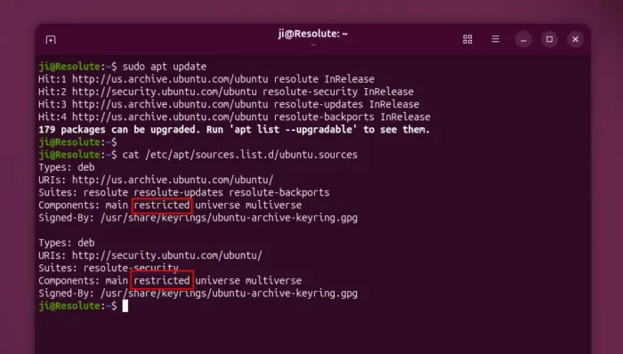- Next, run command to see if the restricted component is included in Ubuntu Sources.