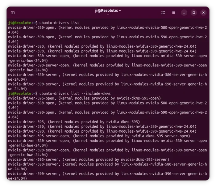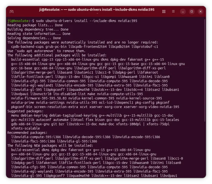 sudo ubuntu-drivers install --include-dkms nvidia:595, which will rebuild the kernel modules the during the installing process. - For server or computing purpose, install the server driver instead: