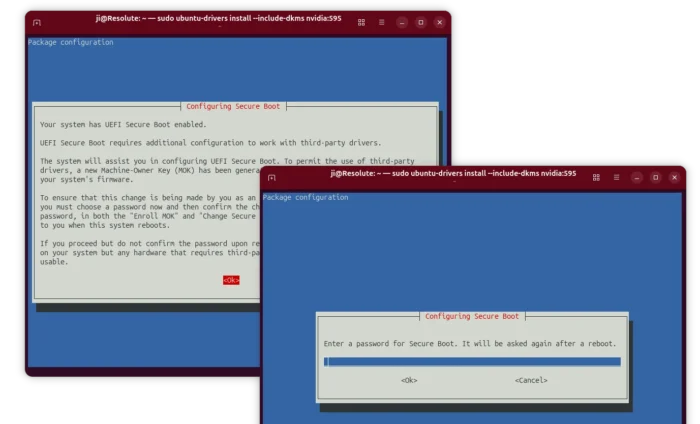 If everything done without error, restart your computer. In next boot, you need to choose Enroll MOK -> Continue -> yes -> input the password you set (no visual feedback) and finally reboot.