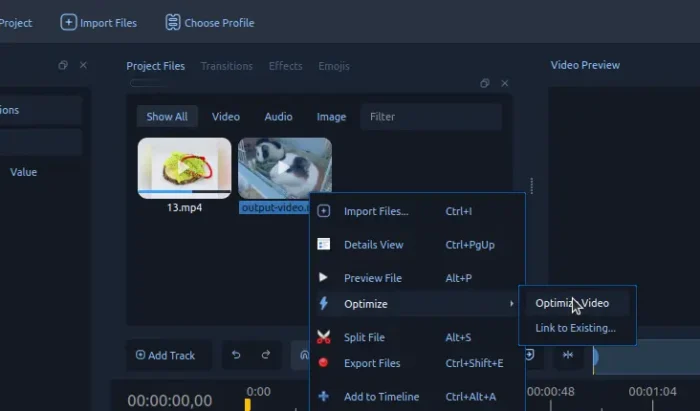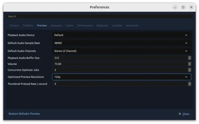 Different to other video editors (e.g., Kdenlive and Shotcut), OpenShot down-scale the original video sources by generating (or linking to) another copy of videos in lower resolution (e.g., 720p, 360p).