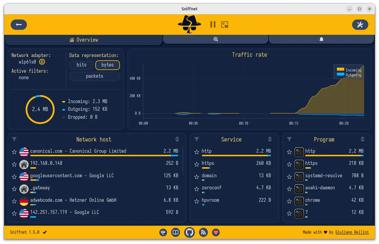 Sniffnet, the popular free open-source network traffic monitoring software, released new 1.5.0 version few days ago.