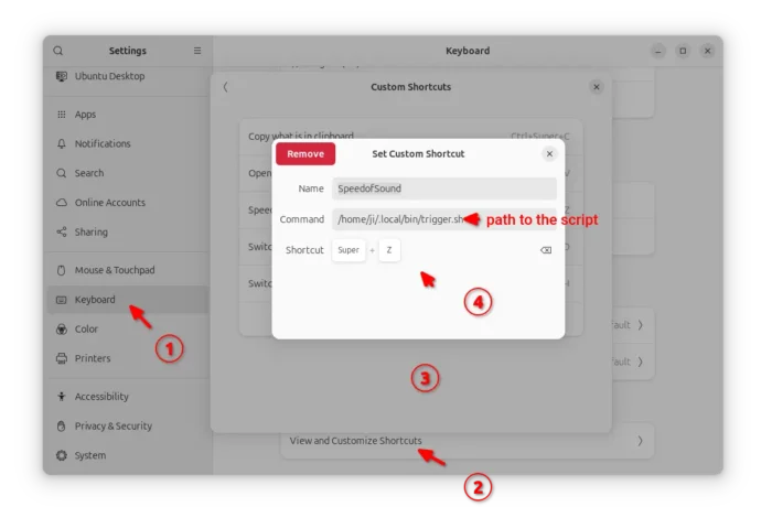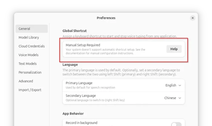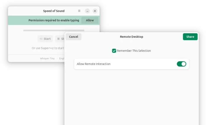 It by default supports Super+Z keyboard shortcuts to start/stop listening, though it only works when the Speed of Sound window is open and focused.