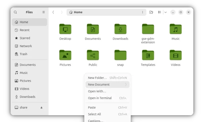 To do so, launch Text Editor and create a new empty document. Then, press Ctrl+Shift+S to open save file dialog. Finally, choose save it to Home -> Templates with whatever file-name you want to display as ‘New Document’ sub-menu option.