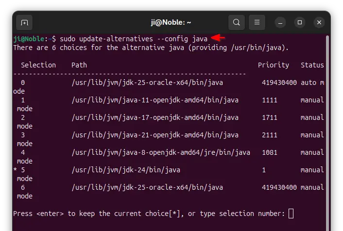 b.) Next, run the commands below one by one, and type number to select Java JDK 21 as default.